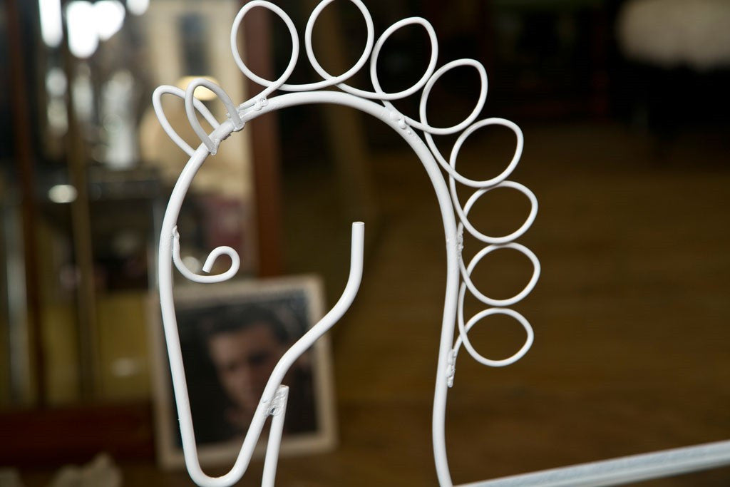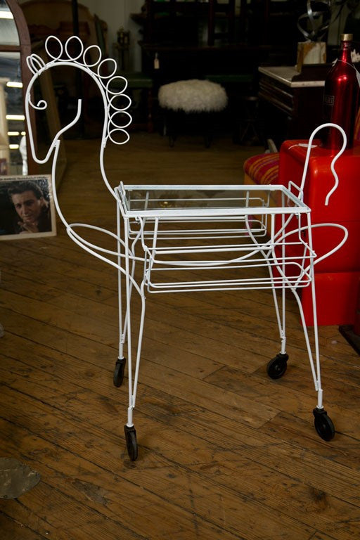 Wheeling horse finished in white lacquer on wire. Top is a removable grass tray for serving. Sides are bottle or glass holders. A unique style piece. Made in the USA circa 1950. Condition: Very Good. 41"H x 36"W x 23"D, Tray 26"H