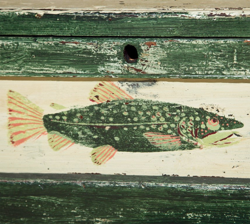 Wooden storage trunk with hinged-top lid. Antique white with green decoration - fish theme. Trunk shows a lot of use with gauges, splits, etc., but gives it a great antique folk art look. Under the trunk lid are laminated pictures of boys fishing on an antique red ground. Made in the USA circa 1900. 25”L x 16”D x 12”H