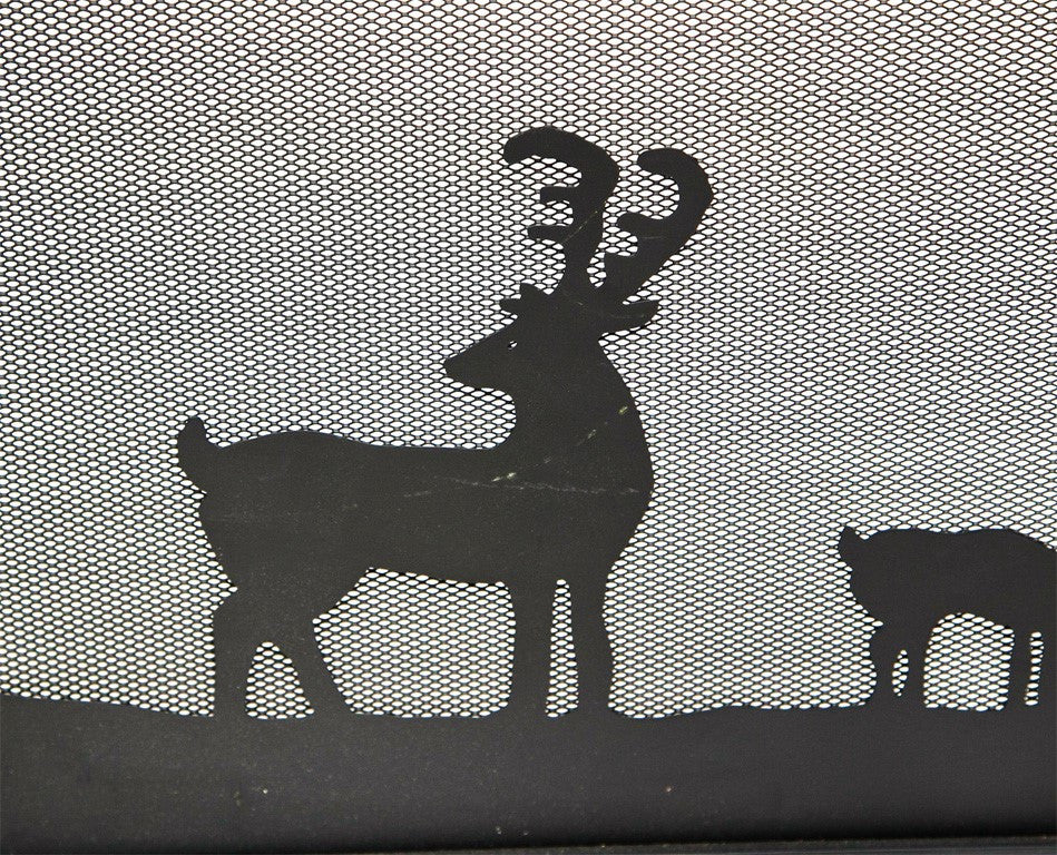 Three part folding screen with black metal. Mesh framed in black metal. Piano hinged. Handles. Hand cut out metal animals behind center screen mesh. Made in the USA circa 1970s. Condition: God. 32”H x 30”W, 12" wide end panels