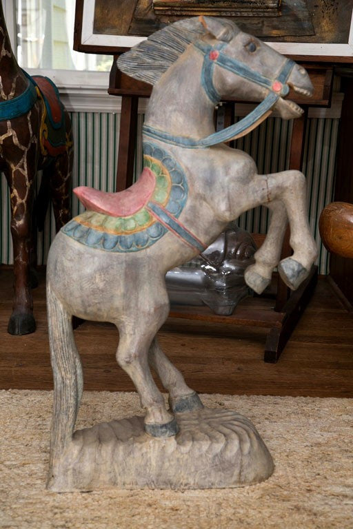 Carved wood statue of a standing horse decorated as a carnival type fixture in miniature. Painted grey background. Made in the USA circa 1930. Condition: Good. 34”H x 20”W x 8”D