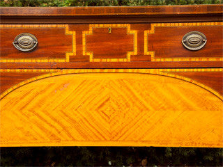 English Sheraton style sideboard with satinwood veneer in geometric designs around the two large drawers and doors; cross-banding on the top. Made in England circa 1870. Condition: Good. Materials: Mahogany wood with satinwood inlays. 37"H x 78"W x 27"D