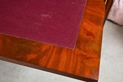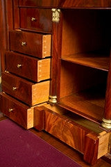 Flame Mahogany wood. It has a fully fitted interior flanked by Corinthian columns and with secret drawers. It was made in Paris between 1860 and 1880. The writing surface is 31" from the floor and is covered in a red wine color felt. The hand chased hardware is finished in dore. Hardware is original. Drawers are hand dove