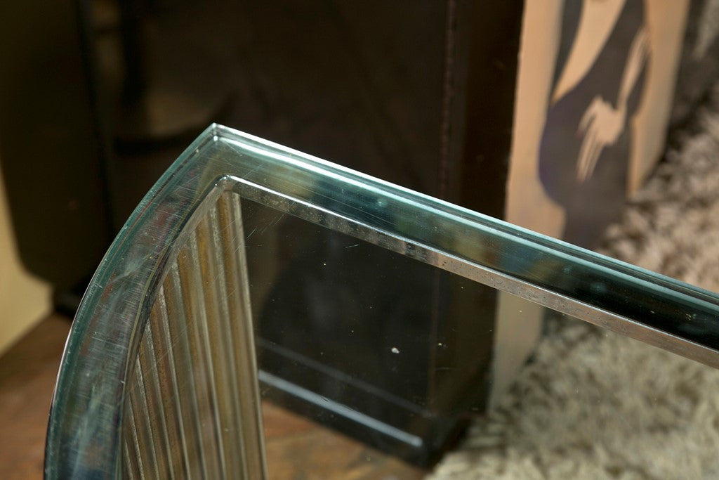 Thirty-six welded supports on the four legs. All in chrome. Semi oval-shaped 1/2" beveled glass. Demilune chrome support under frame connecting legs and supporting glass. Attributed to 1970's Los Angeles furniture maker, Vermillion, who made many Art Deco reproductions. Condition: Excellent. 28"H x 67"W x 17"D