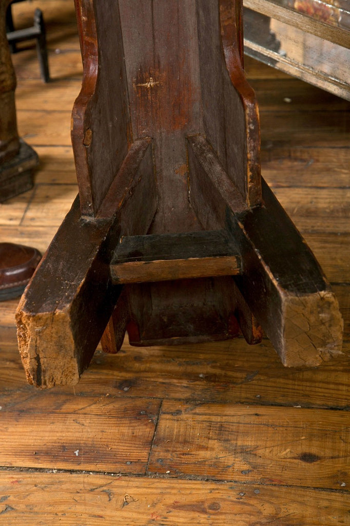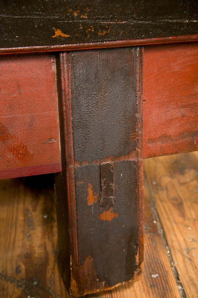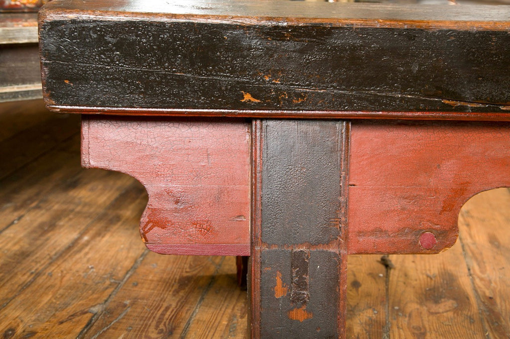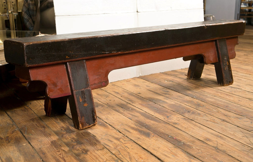 In 1948 the wealthy people left China with their money and jewels but left behind their furniture, which the Government stored in warehouses. Fifty years later that furniture was put into containers and sold to stores in Western Countries. There was no way to determine how old each item was. This bench was part of one of those containers. The bench is about 200 years old, made of elm wood from northern China. It has been painted and time and use has worn much of it off. The 4"thick elm board seat is 72”L. Condition: Distressed. 18"W x 72"L x 8"H