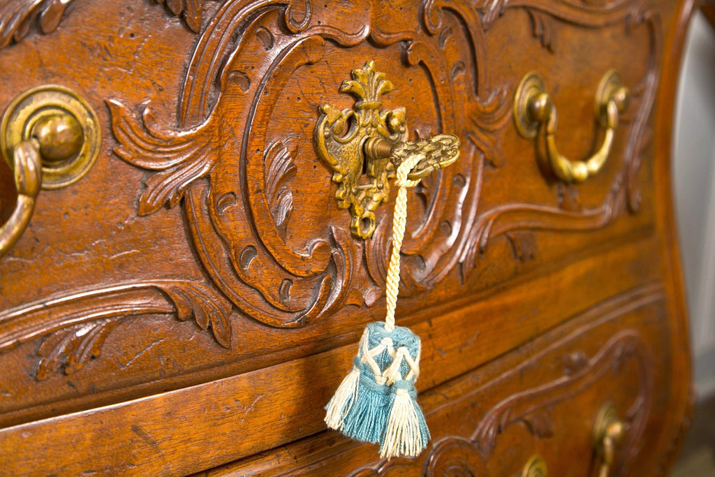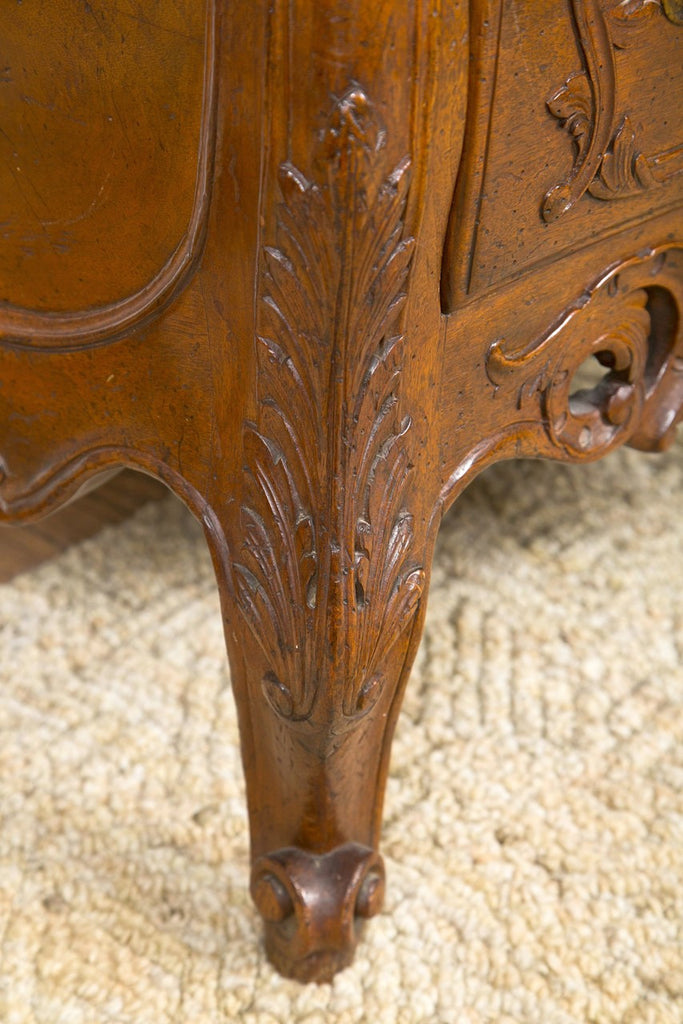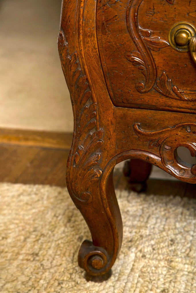 Made by Don Ruseau's New York factory in the 1940's, this hand made exact reproduction commode is perfect in its details. All of the craftsmen in that factory were French as well as the walnut wood which was imported from France before WWII. This is one of the finest pieces of French furniture ever made. Hand dove tail and oak drawers. Drawers are lined with blue and white wallpaper. Condition: Excellent. 30”H x 18.5”D x 37”W