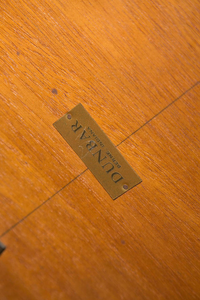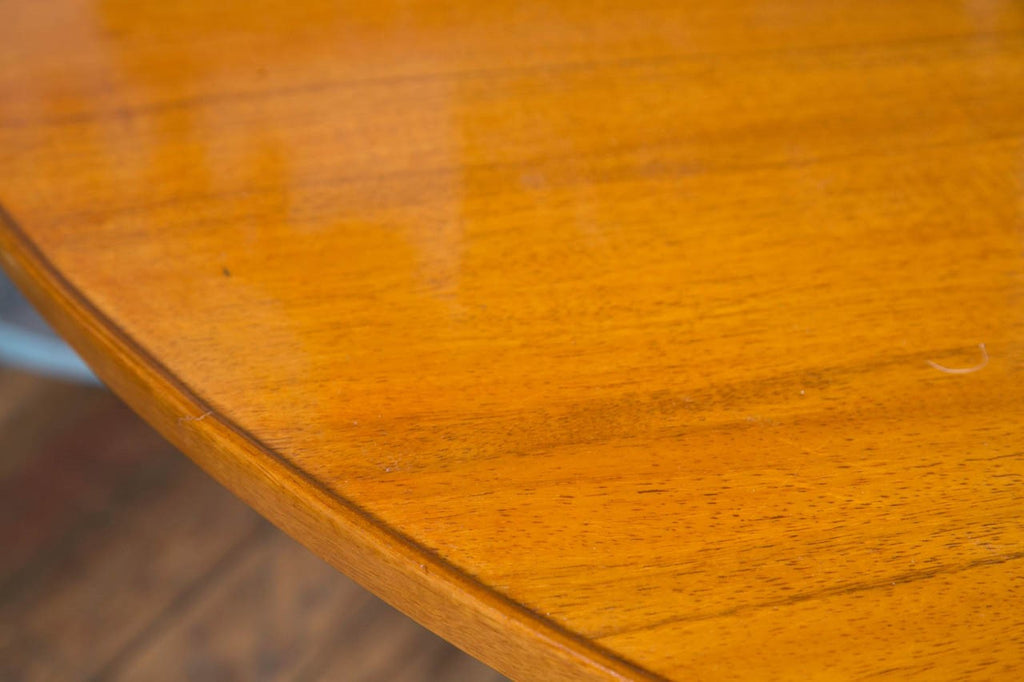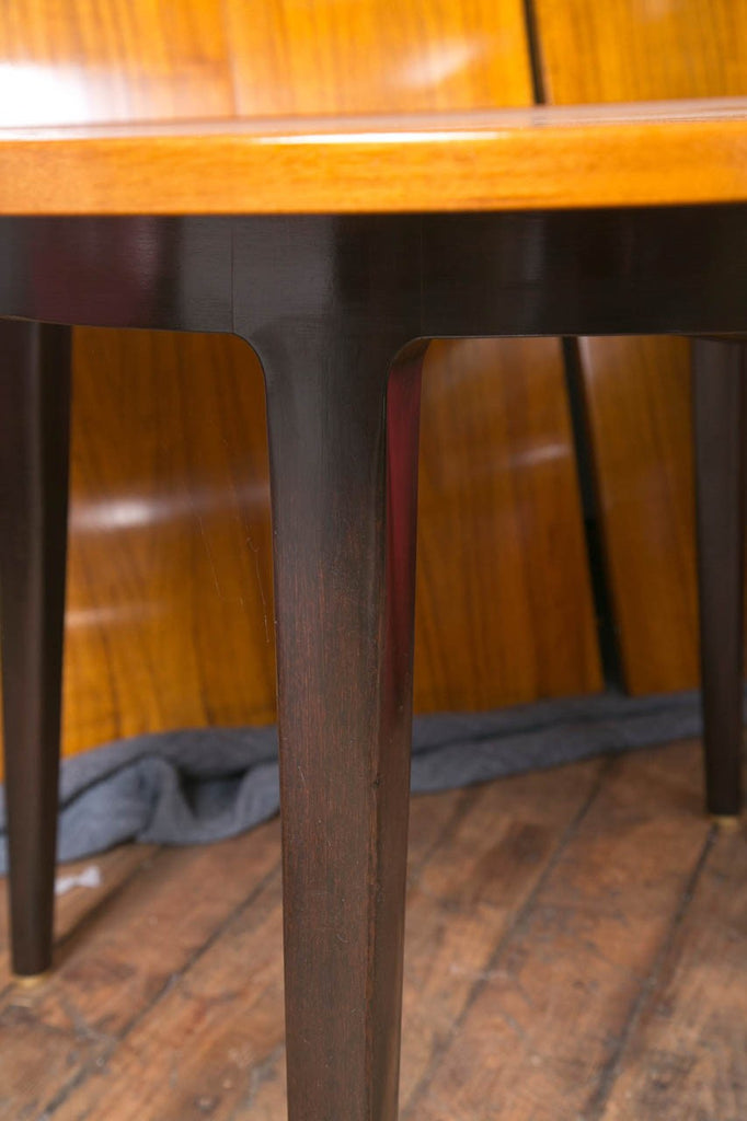 Edward Wormley/ Dunbar Dining Table with round figured Tawi wood top, mahogany apron, and legs with brass capped feet. There are four 15" matched leaves: the 54" diameter becomes 114" fully extended. There are two hinged fold-up-legs to support leaves when extended. Top grain design matched when extended. Made in the United States circa 1950. Condition: Excellent. 30"H x 54"Dia