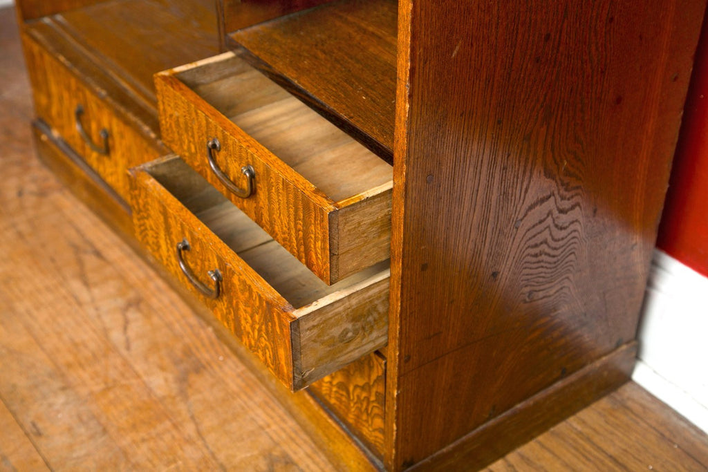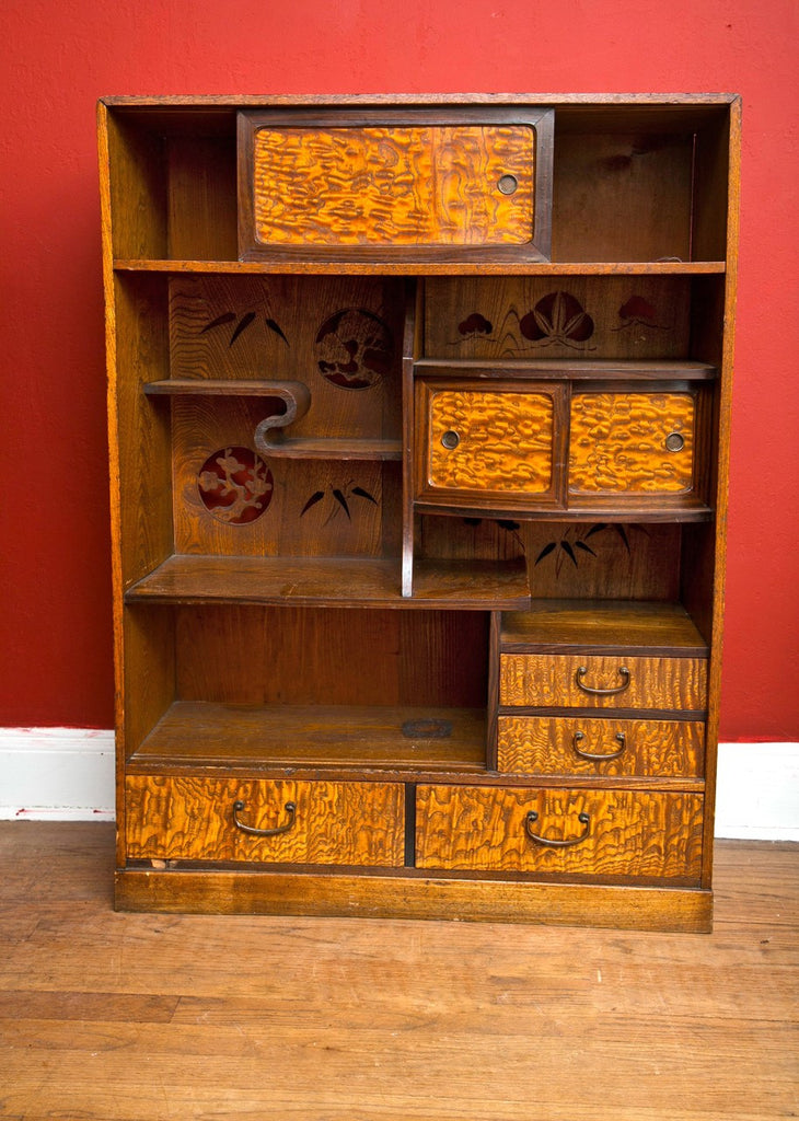 This is a 38" high cabinet with four drawers and two sets of doors. It has open areas and parts of the back that are routed out to form designs. It also has an "S" shaped shelf. Very Unique cabinet. Tamo wood drawer and door faces. Tamo is a heavily figured wood from Northern China that is related to Elm Wood. The balance of cabinet is elm wood. Made in China circa 1950. Condition: Excellent. 38"H x 10.5"D x 28.5"W