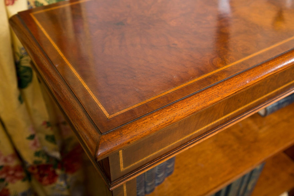 40" high bookcase in English Myrtle Burl. 3 shelves ( 2 adjustable ). Boxwood inlays on top, apron and front. Shelves are adjustable with ratchet side supports. We can supply multiples of this bookcase. Made in England circa 2010. Condition: Excellent. 40"H x 12"D x 40"W