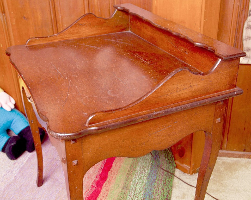 Writing table in birch wood with a small raised shelf on the back. Drawer in the apron with ball pull in brass. Large dowel heads over legs. Made in the USA circa 1960. Condition: Good; a few scratches on top surface ( may be part or the distressing ). 30”W x 24”D x 34”H