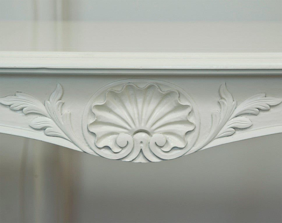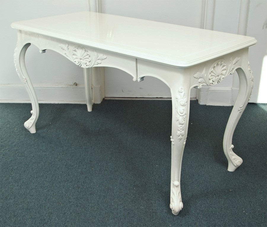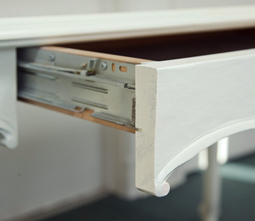 Made by Frederick Victoria in 1960 for carpet designer and manufacturer Edward Fields. Table has been refinished in white lacquer recently. 1/4" beige stripe on top. Narrow drawer has a metal slide. Made in the USA circa 1960. Condition: Very Good. 27.5”H x 48”W x 22”D