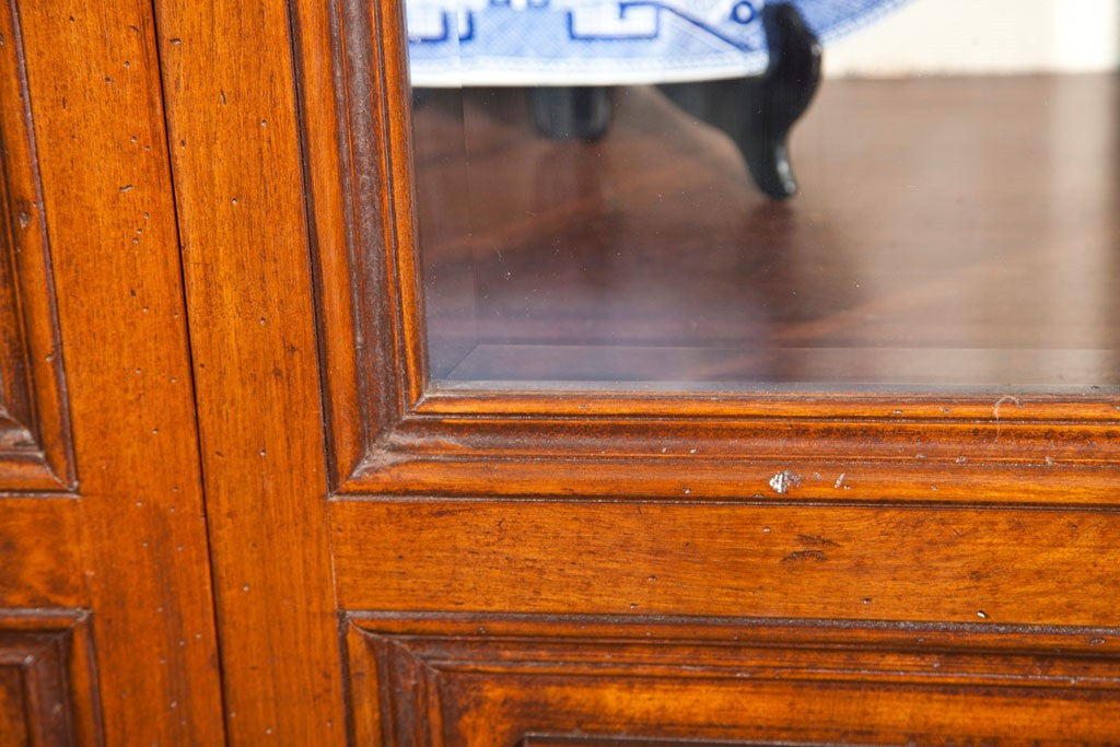 Large walnut wood Italian style reproduction cabinet. Top cornice removable. Beveled clear glass doors. Ratchet side supports for adjustable shelves. Chenille fabric back. Made in Italy in the late 20th Century. Condition: Excellent. 90"H x 64"W x 16"D