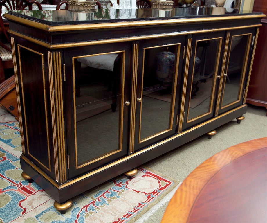 Burnished ebony display cabinet with gilt trim, glass doors, lights inside and glass framed shelves. Interior lights dimmable by touching hinges. Granite top. Condition: New. 39"H x 76"W x 17"D