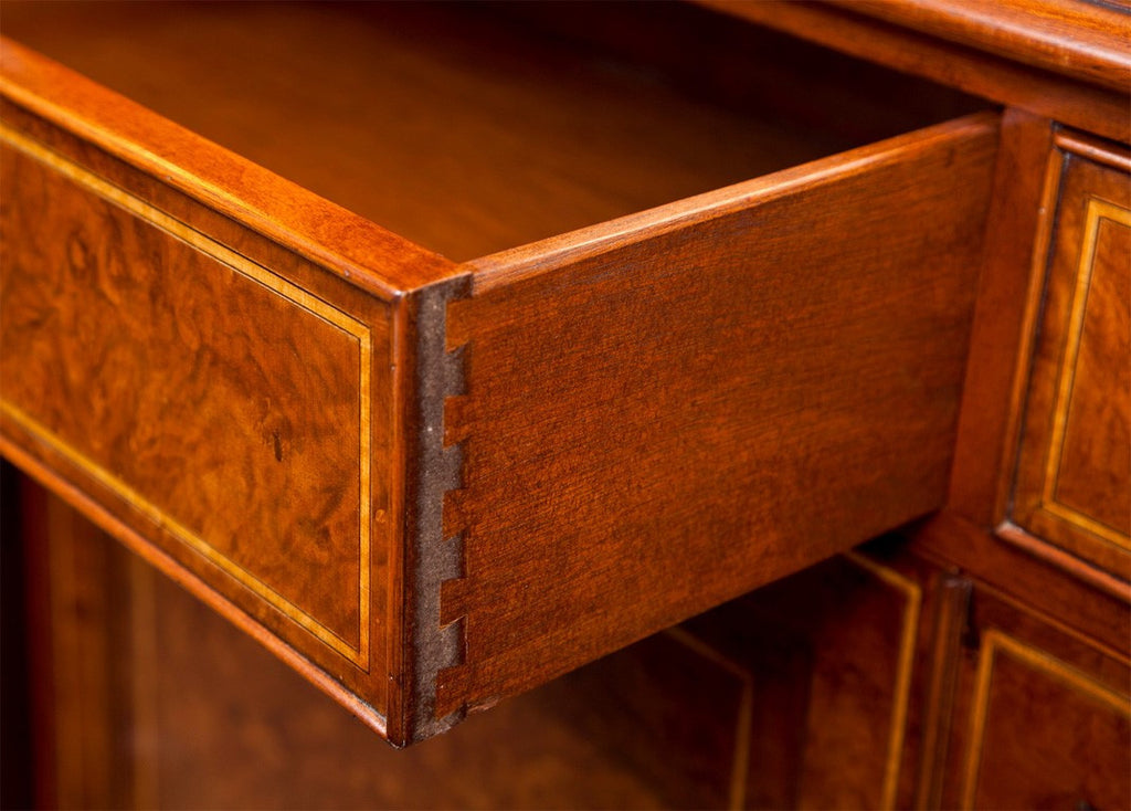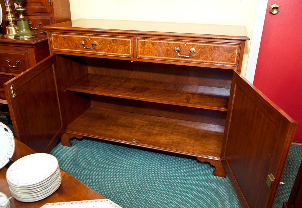 Two door cabinet made of myrtle wood with inlays of satin wood and ebony. Two drawers on top, and drawers are dove tailed. Adjustable shelf inside. Locks on doors and drawers. Made in England circa 1980. Condition: Excellent. 36"H x 50"W x 18"D