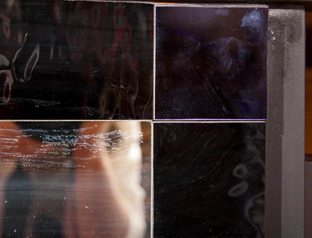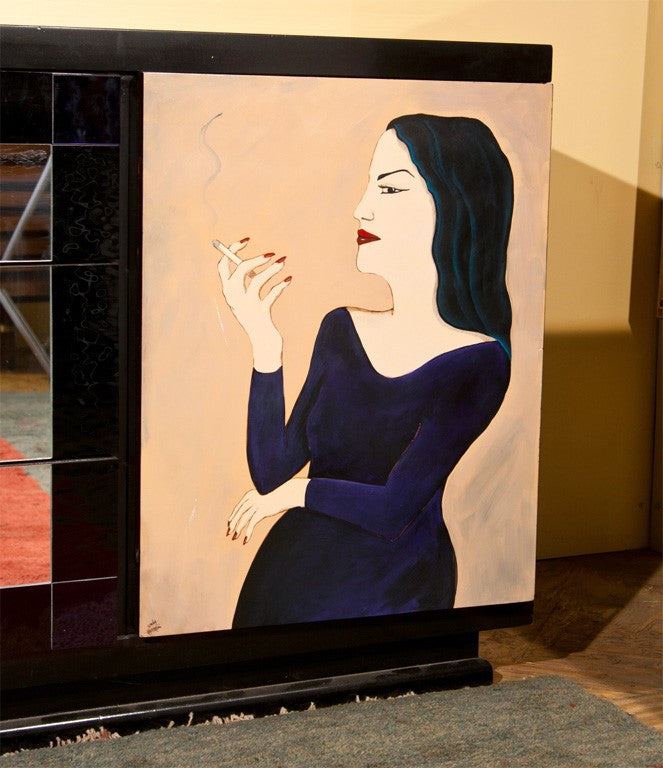 Black lacquer dresser with mirror drawers in the middle with applied colored mirrors. Tray drawers behind the doors. Doors are hand painted portraits of women. By Sandy Mastroni, Connecticut artist. Condition: Very Good. Made in the UNITED STATES circa 1980. 32"H x 72"W x 22"D