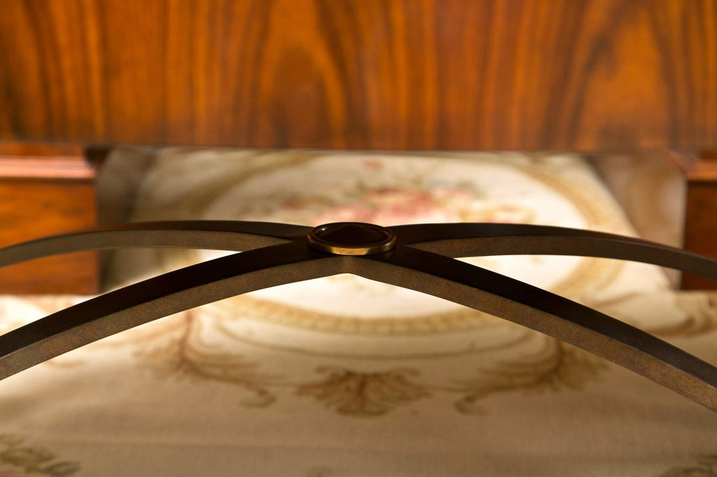 A fine marquetry veneered cocktail table. Marquetry strung and dished top under a tempered glass insert. Four cabriole legs joined by arched verdigris iron stretchers. Made circa 2000. Condition: Excellent. 19"H x 30"D x 44"W