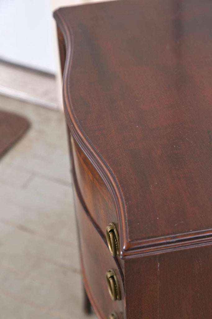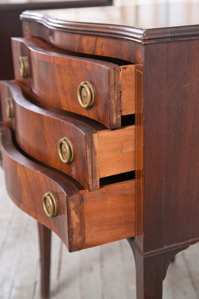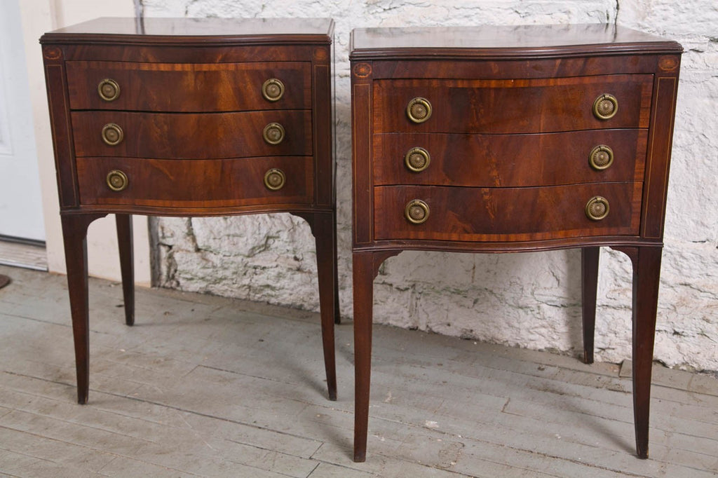 These small tables were made by Johnson-Handley-Johnson of Grand Rapids, Michigan, USA. They are examples of the fine cabinetry that this firm produced. Designed by Tom Handley, who was staff designer for Johnson Furniture since 1908 and became a partner in 1922. The tables have a serpentine front with intricate inlay, typical of Handley's designs. Johnson Furniture was founded by three brothers who emigrated from Sweden in 1887. Tom Handley worked for Waring and Gillow in London as their in house designer. Made in the United States in 1923. Condition: Good. Mahogany exteriors with oak drawer interiors. 27.5"H x 15.5"D x 19"W