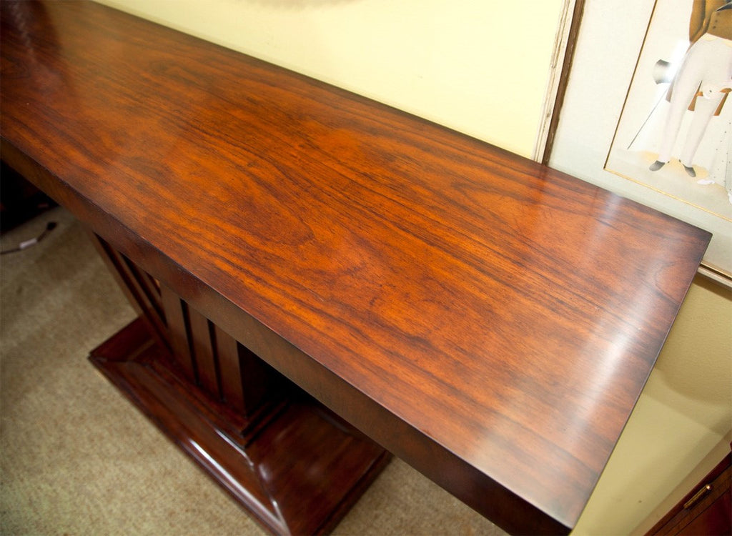 Hyedua Crown veneered console table. Rectangular top above a fluted offset " V" shaped keystone base. Centered by an Olive Ash Burl dart panel which is above a shaped and stepped base. Condition: Excellent. 36.5"H x 12"D x 60"W