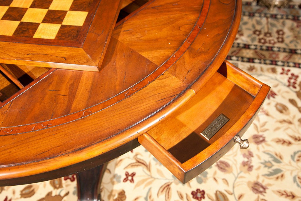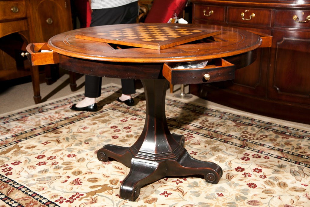 Inlaid quarter walnut top with removable board. Leather on one side and chess board on the other. Backgammon board in well. Antique black base. Made in Vietnam. Condition: Excellent. 29.5"H x 42"Dia