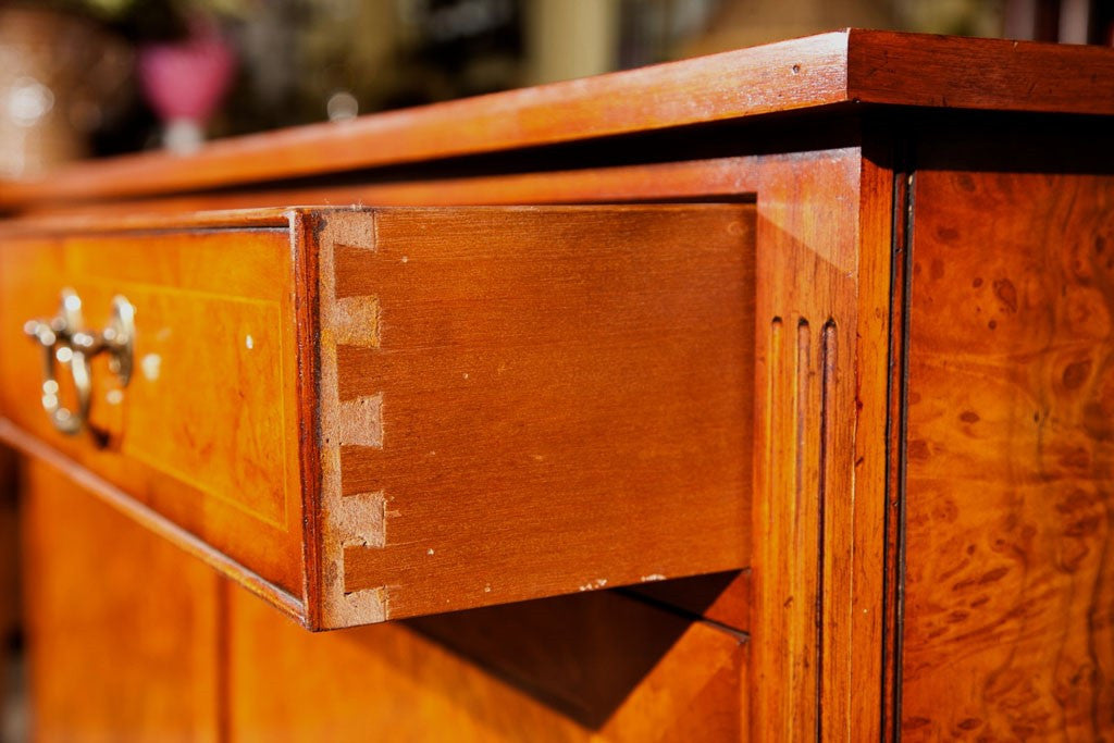 All myrtle wood, inlaid sun burst doors. Two drawers and two doors. Only 11.75" deep. Adjustable shelf behind doors. also available 32"W x 11.75"D x 34.5"H $1895. Made in England. Condition: Excellent. 34.5"H x 11.75"D x 45"W