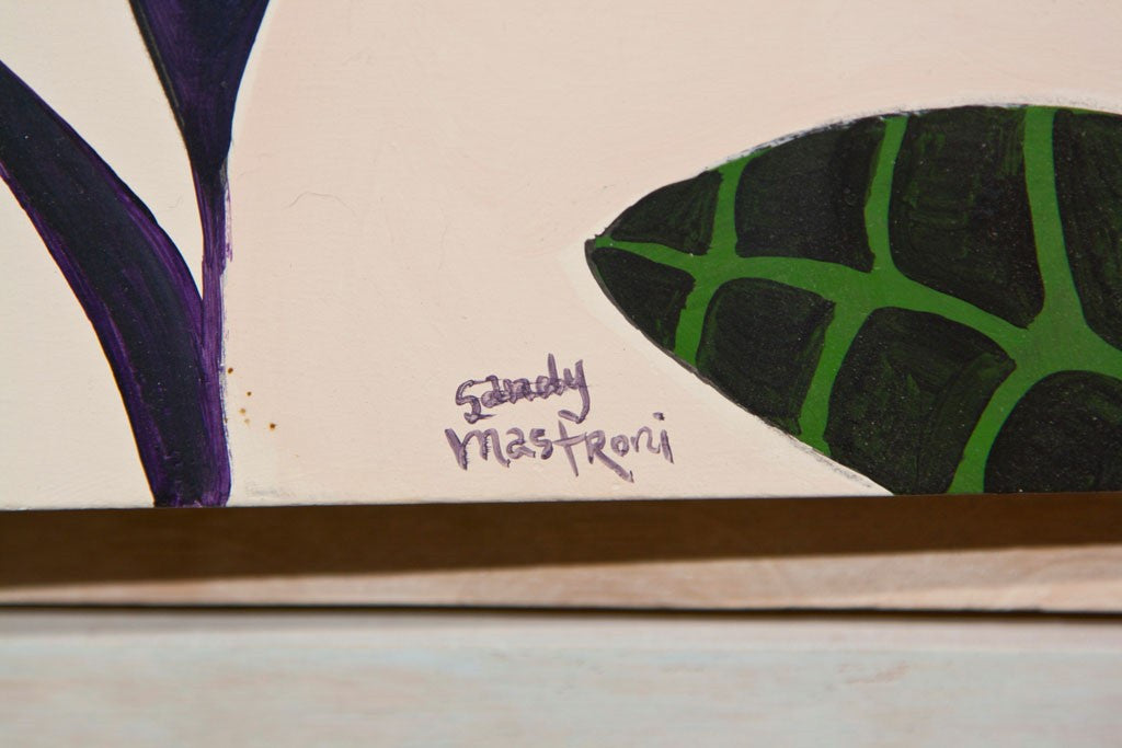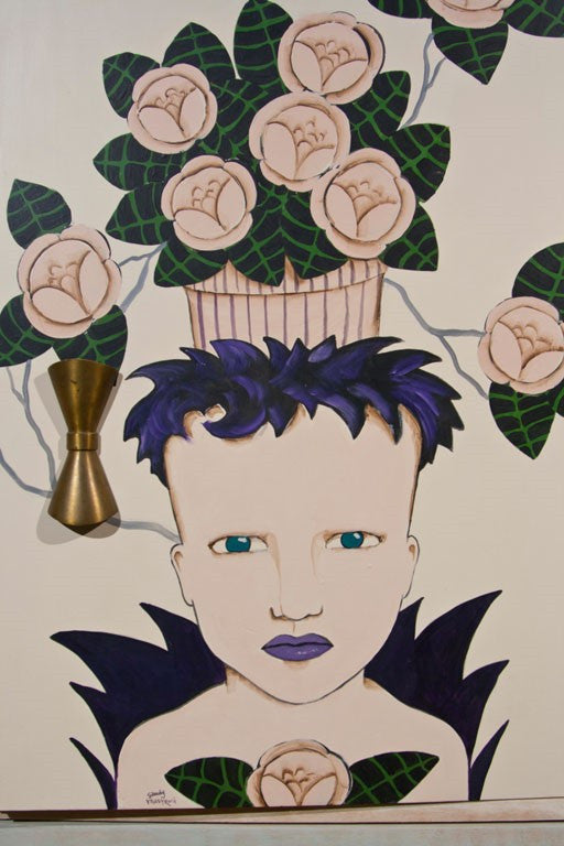TPOP3 redesigned this Red Lion of Philadelpha chest. Noted artist, Sandy Mastreoni of Connecticut is the artist who painted "the whispers of the red twins." Pullout mirror and 5 tray drawers. A write up on the artist was published in Better Homes And Gardens. Made in the USA circa 1950s. Condition: Good. 49"H x 46"W x 20.5"D