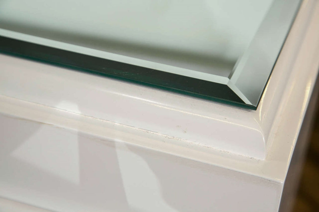 White Lacquered Credenza with Juxtaposing Mirrored Doors and Top