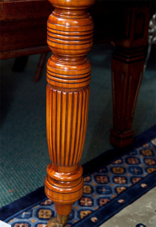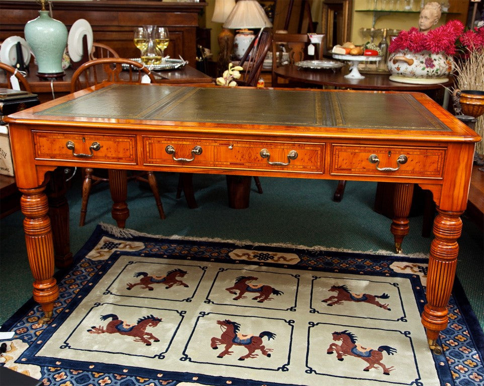 English yew wood partners writing table with green leather top and gold tooling. Six drawers, with three each side. Brass cup and castors. William IV style Made in England circa 1980. Condition: Excellent. 31.5"H x 36"D x 60"W