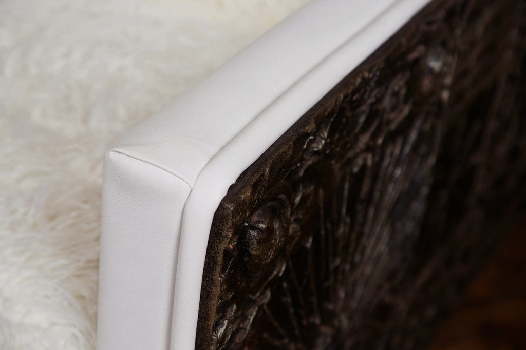 Five foot upholstered loveseat designed by Adrian Pearsall, made by Craft Associates in the style of Paul Evans. Cast resin sides and back panels. Unique design. Upholstered in white naugahyde with faux Mongolian Fur pillows. Recently reupholstered. Made in the USA circa 1970. Condition: Excellent. 26"H x 36"D x 60"L, S/H: 16"