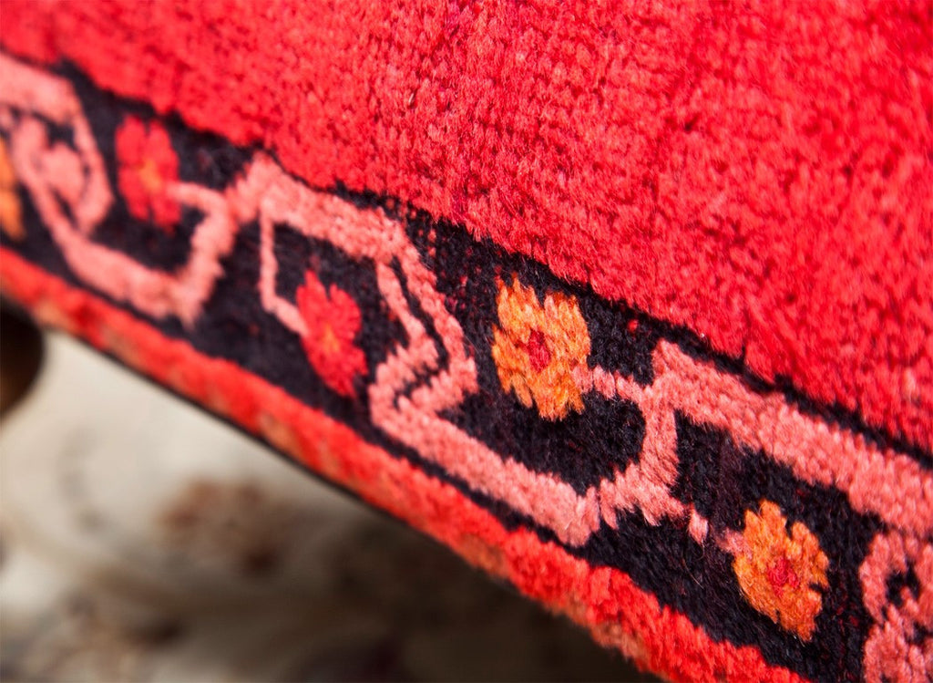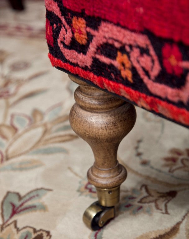 Bench is covered with a regular wine color oriental carpet which is an antique. It is one of a kind. Short wood legs with castors. Light wood finish. Made in the United States circa 1980. Condition: Excellent. 16.5"H x 35"W x 22"D