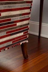 Recently reupholstered in a fine multi colored striped chenille. Mahogany legs with box wood inlay. 32"H x 87"W x 34"D, 18"SH, 24"ht arm. Made in England circa 1915. Condition: Excellent.
