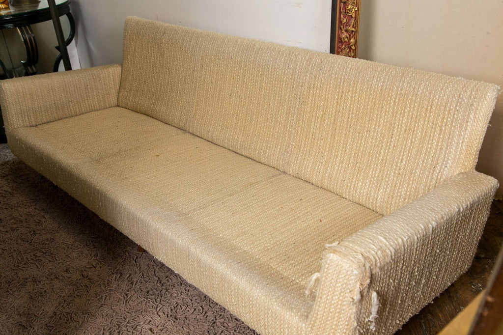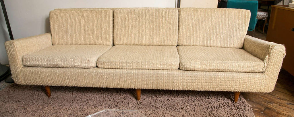 Three sets of Maple stained wood legs hold this iconic sofa in place. The sofa is offered "as is." Haitian Cotton is worn and torn. Sofa has coil springs and firm pillows. Arm height 23" Sofa has a great provenance: it comes from an Ulrich Franzen designed house in Essex, Connecticut, USA. Made in the United States circa 1952. Condition: Fair. 39"H x 29"D x 84"W, S/H: 18"
