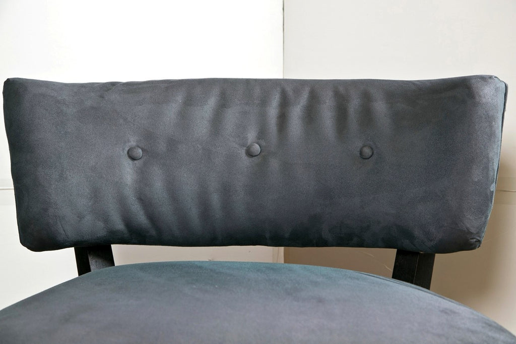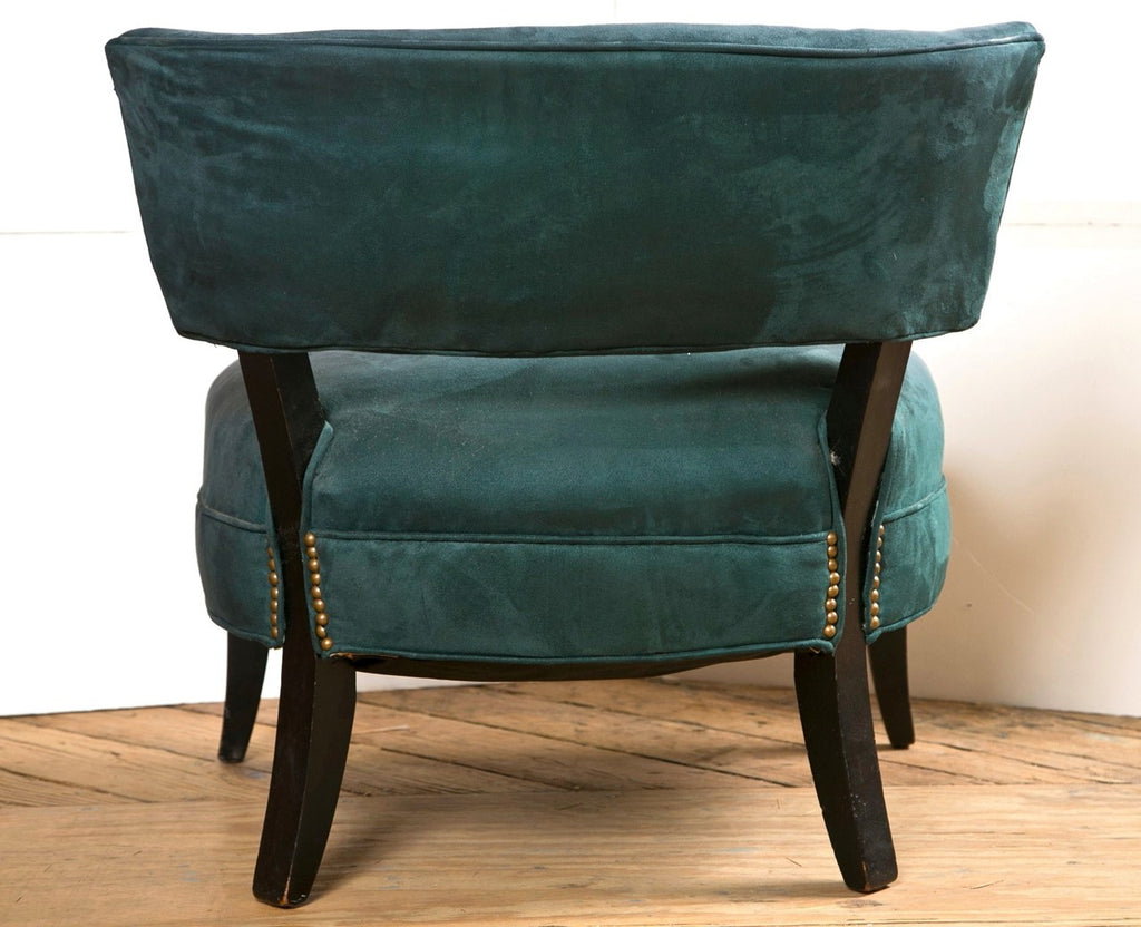 The ebonized legs on this chair are flared or tapered while the upholstery is a gunmetal micro-suede. Recently recovered. There are nickel nail heads above the legs. The spring construction verifies the 1940's time frame. Coiled sprung with burlap straps for support. Made in the United States Circa 1946. Condition: Excellent. 28"H x 27"W x 21"D, S/H 16"