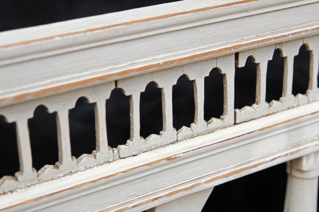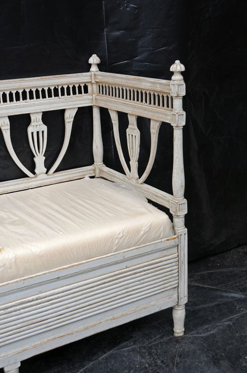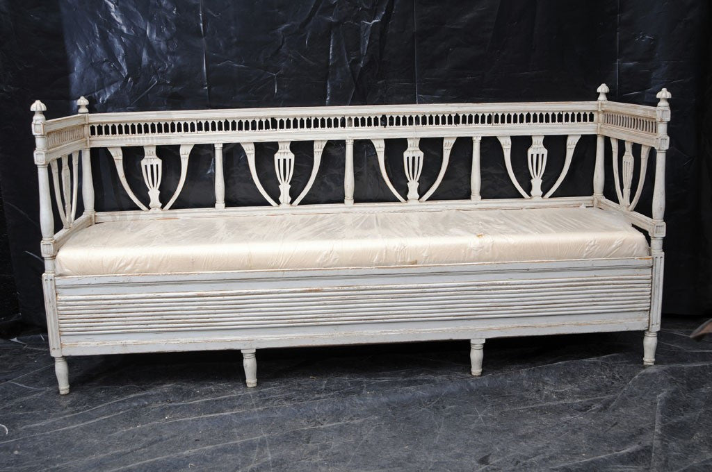 Antique hand-carved wood sofa. Gustavian. Reupholstered seat in white muslin, milk paint finish in off white. Made in Sweden circa 1830. Birch wood frame. Condition: Very Good - age appropriate. 37"H x 80"W x 24"D, S/H: 19"