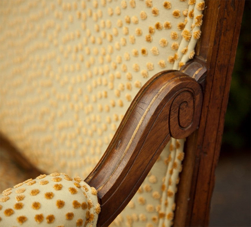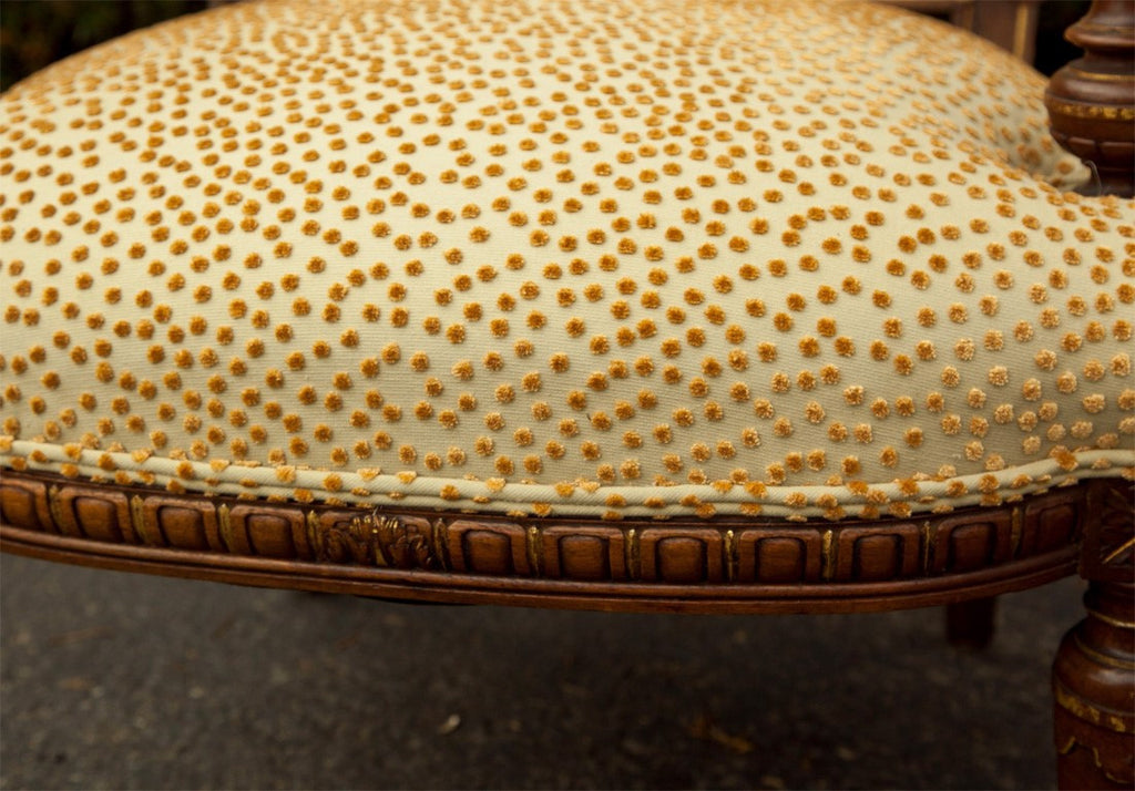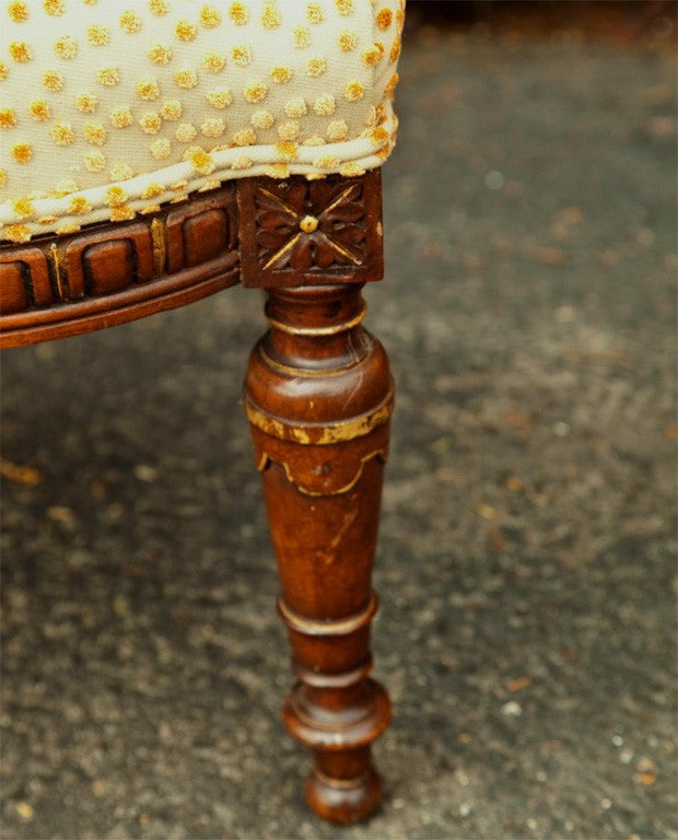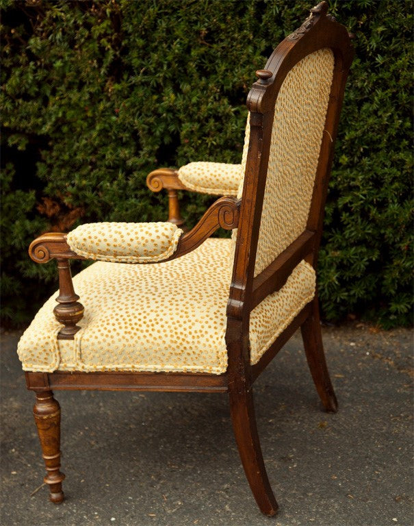 A pair of 19th century French Napoleon III style chairs featuring a detailed crest consisting of a heraldic shield, surrounded by acanthus leaves and all gilted trim. Recovered. Made in France circa 1880. Mahogany wood. Condition: Good. 39"H x 24"W x 20"D