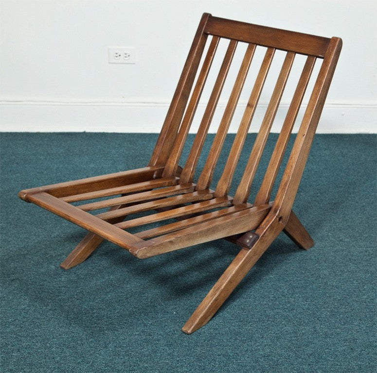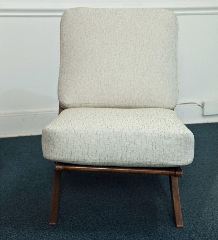 Original walnut frame chairs with sprung pillow upholstery. In the style of Robert Mallet Stevens. Original fabric slats on both seat and back. Chair does not fold. Made in Denmark circa 1940 - early postwar. Condition: Age appropriate. 30"H x 21"W x 32"D
