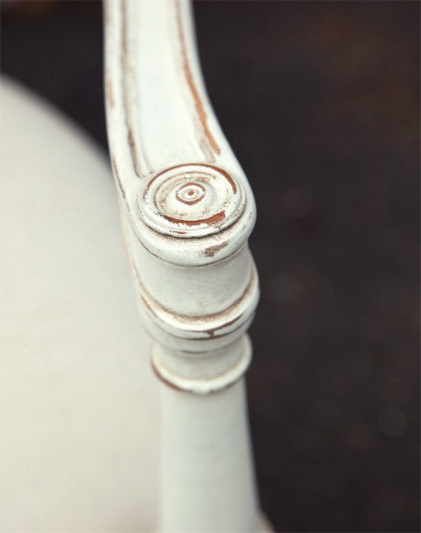A rare pair of Gustavian armchairs called King Kolar Chairs. Restored with oyster milk paint. Recovered. Made in Sweden circa 1905. Condition: Good. Beech wood frame. 48"H x 25"W x 23"D