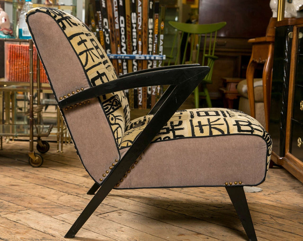 Pair of lounge chairs with open arms. In the series "The Sopranos," the chairs were used by Dr. Melfi, Tony Soprano's psychiatrist ( "shrink" ), for her patients. The chair trim is an extremely muted plum color which borders on grey. It compliments the muted khaki and black chenille print with asian symbols on it. It is always good to see a Cormorant and a fish side by side... the only thing that is missing is the fisherman. These chair frames were made in the 1950's and are in good condition. Black lacquer arms and legs. These chairs have been reupholstered recently. Made in the United States circa 1950. 37"H x 35"D x 26"W, S/H: 16"